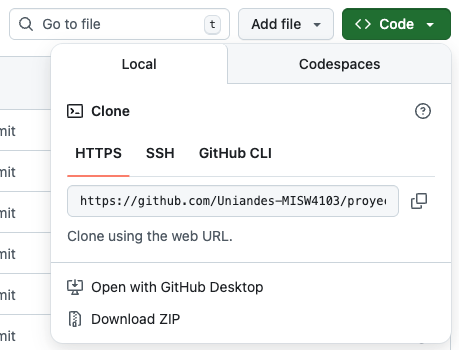En la parte superior, se resalta el botón "Code", que permite obtener el código fuente. Al hacer clic en él, se desplegará un contenedor con un campo de texto que contiene la dirección del repositorio y dos botones debajo de él, como se ve a continuación: