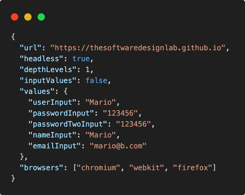 En la imagen anterior se muestra el contenido del archivo config.json. El parámetro url indica la dirección de la página web que se va a probar. El parámetro headless es un booleano que indica si el navegador se va a ejecutar en modo headless (sin interfaz gráfica). El parámetro depthLevels indica qué niveles de profundidad debe tener el árbol generado a partir de las interacciones posibles en la interfaz gráfica. El parámetro inputValues es un booleano que indica si se deben utilizar credenciales o los valores del parámetro values. Los parámetros al interior del parámetro values son utilizados para introducir valores específicos a campos del sitio web: en este caso, la llave corresponde al id del elemento en el DOM y el valor corresponde a la cadena de texto que se introducirá en el campo con dicho id. Finalmente, el parámetro browsers indica en qué navegadores se quiere probar la página y puede tomar los valores "chromium", "webkit" o "firefox".